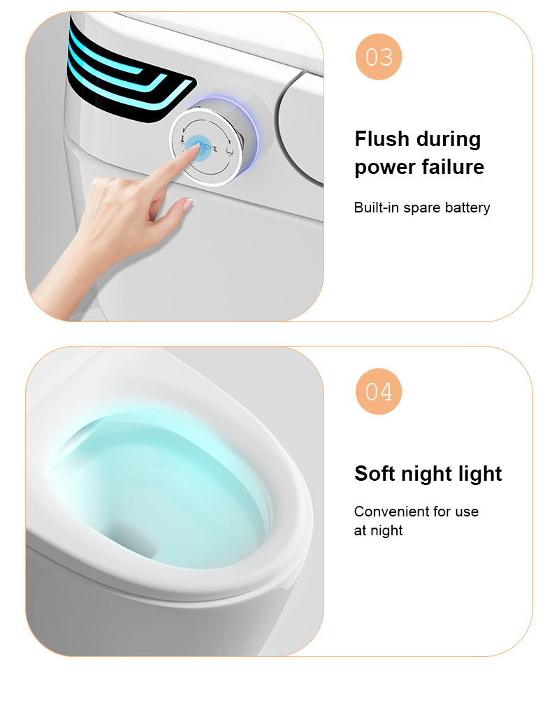 [AUTOMATIC FLUSH ]: When the auto flush function is turned on, it will automatically flush after detecting user departs from the seat, which is a hands-free operation.