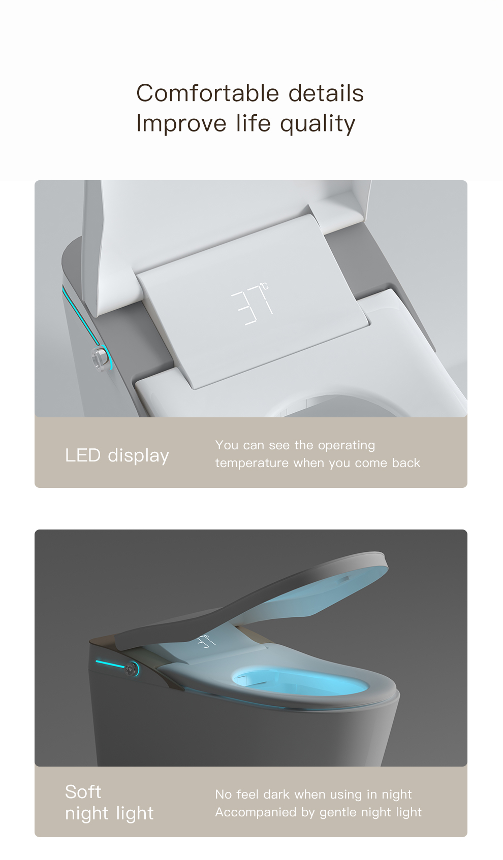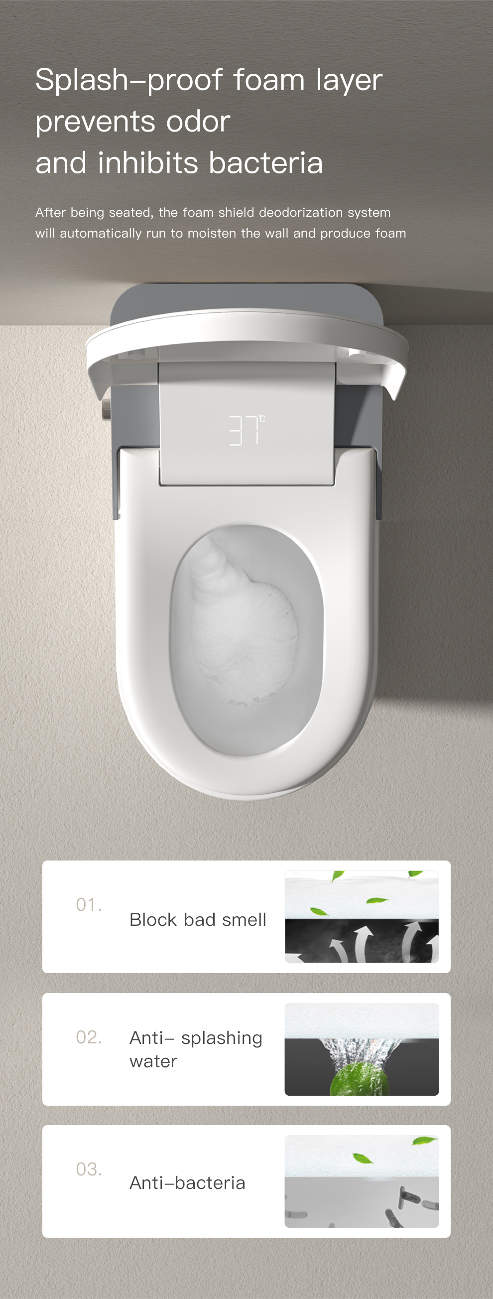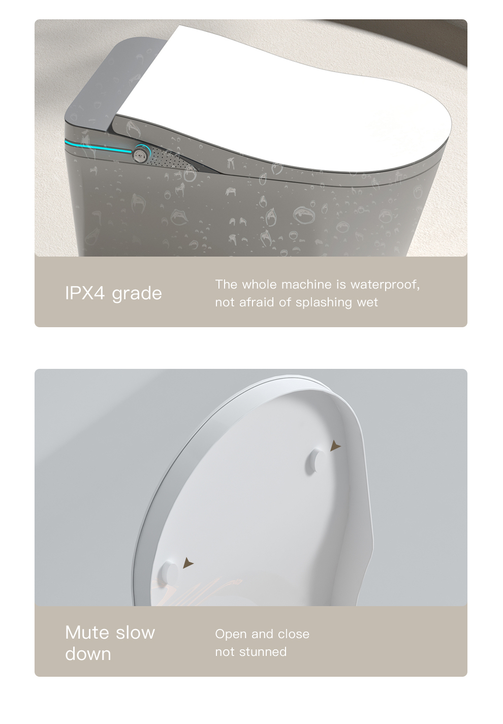 [SMART SENSING AUTO OPENING/CLOSING]: Toilet lid automatically opens and closes when one approaches or leaves, which meets the hands-free standard and is considered more hygienic compared to other toilets.